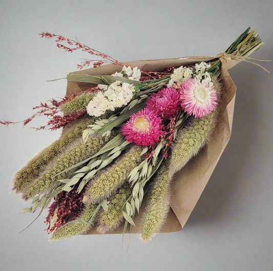 Pink Strawflowers and Grains Petite Bouquet | Dried Flowers