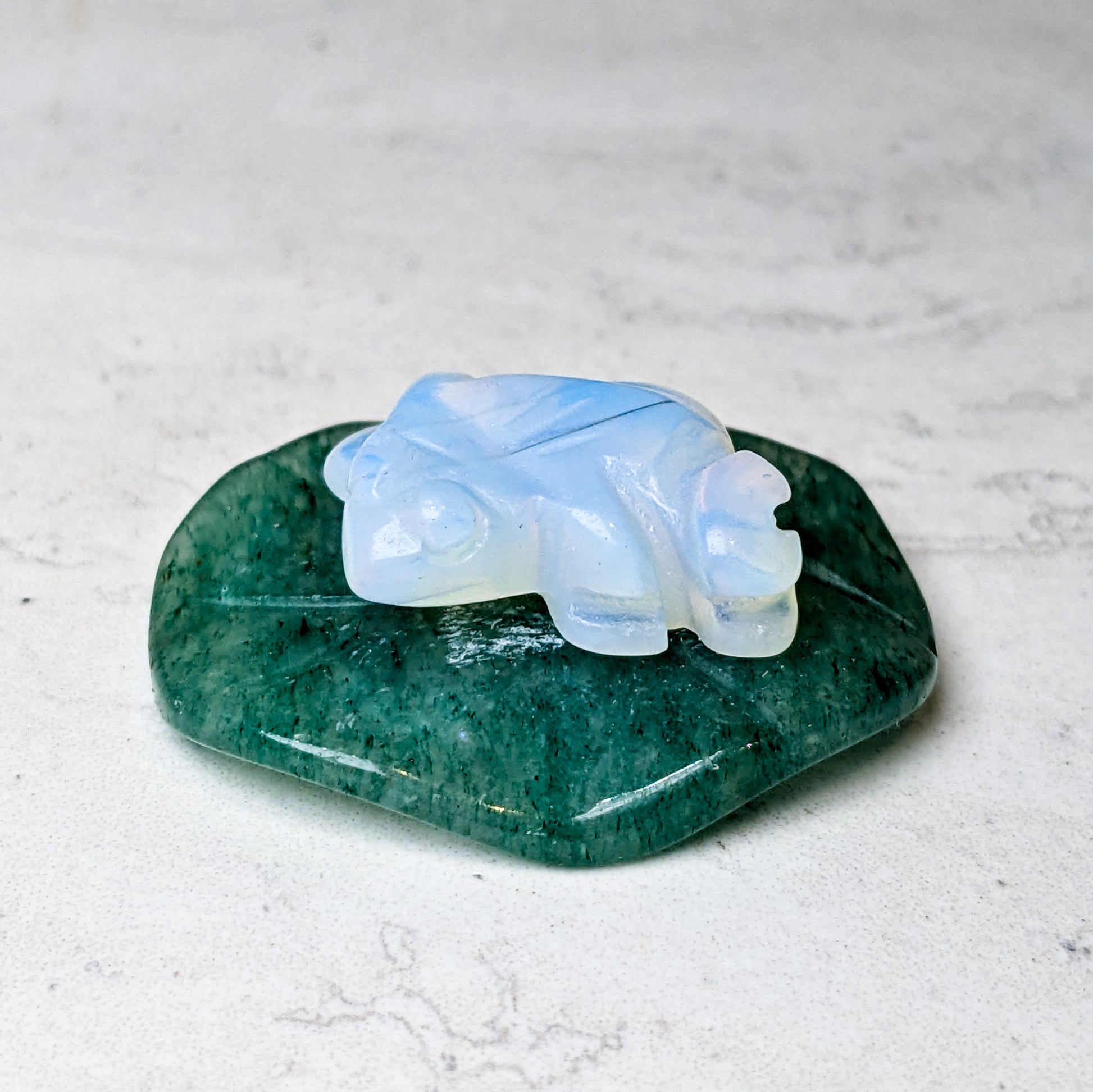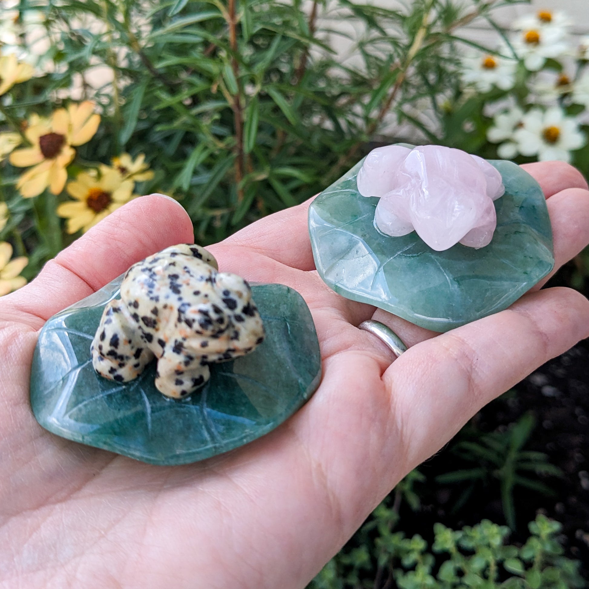 Experience the powerful energy and beauty of our Crystal Frog on Green Aventurine Lily Pad! Choose a two-inch statuette from rose quartz or Dalmatian jasper, hand-carved with lush green aventurine. One-inch pieces come in opalite, sodalite, jasper, and sandstone. This spiritual piece encourages cleansing of mind, body, and soul, letting go of emotional baggage and embracing healing.