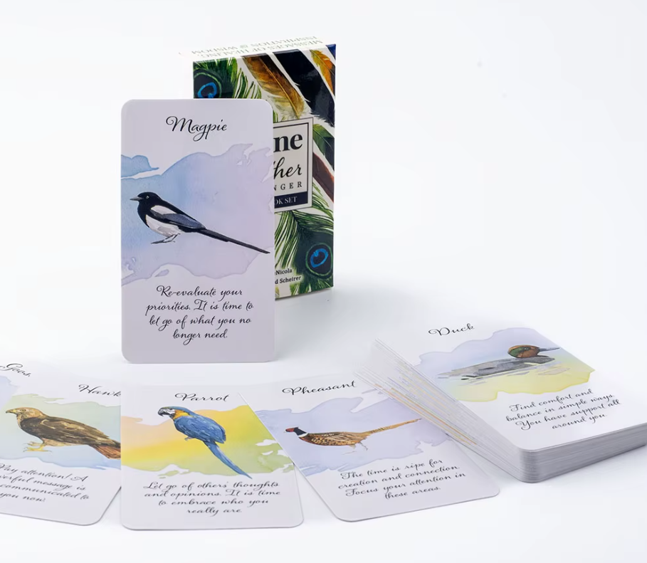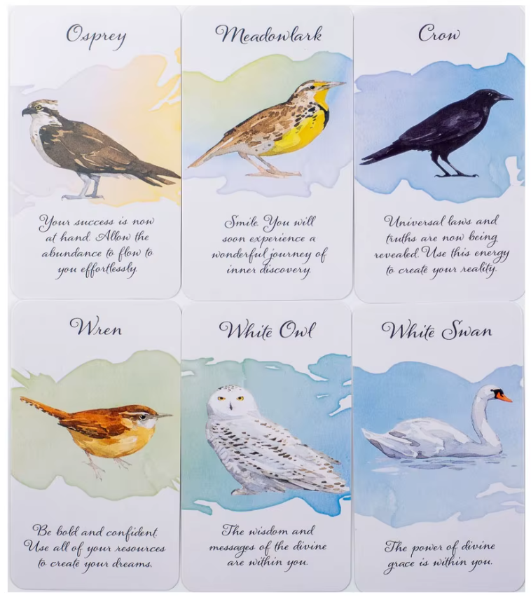 This inspirational deck brings the angelic insights and healing energy associated with “finding feathers” to those who seek divine guidance from the mystical realm of birds. Double-sided cards present feather art on one side, with a watercolor image of the bird and an affirmational message on the reverse. The guidebook shares special stories about the 44 different birds and relates their natural symbolism to colors, seasons, elements, and special energies. Set includes 44 double-sided cards.