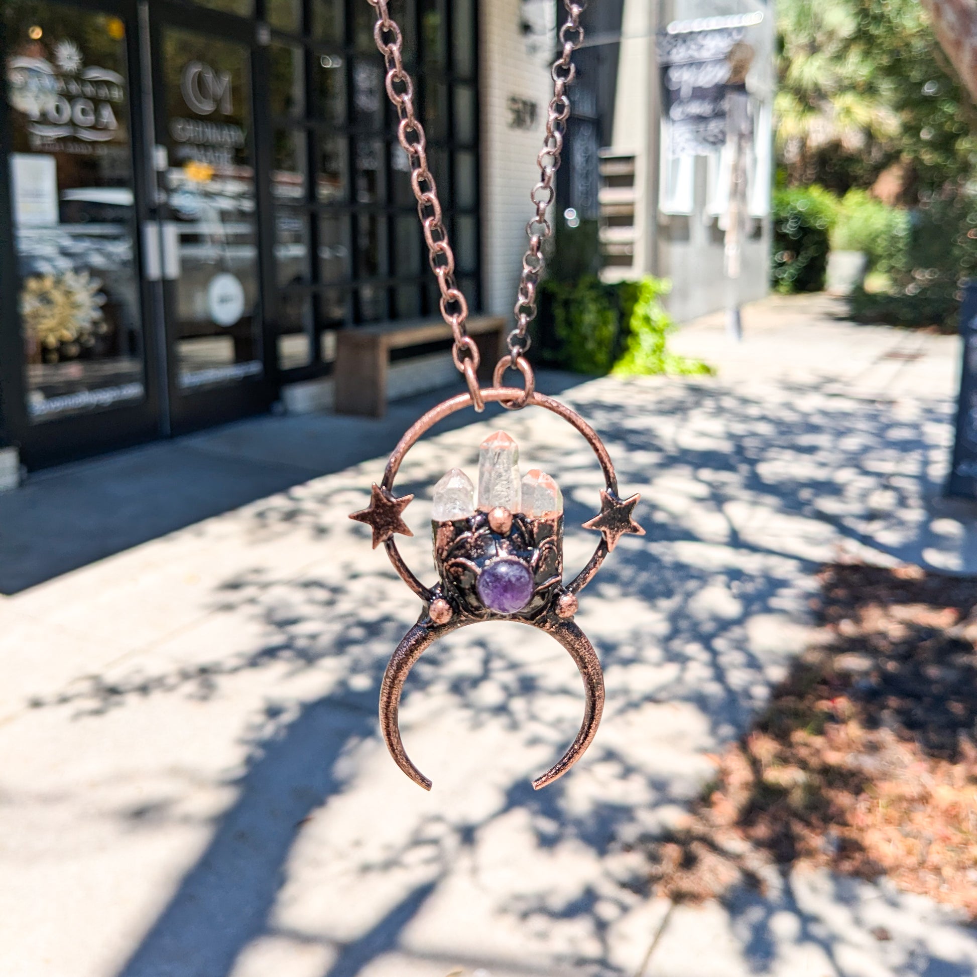 Clear Quartz & Amethyst Star + Moon Necklace – Vintage Copper Finish