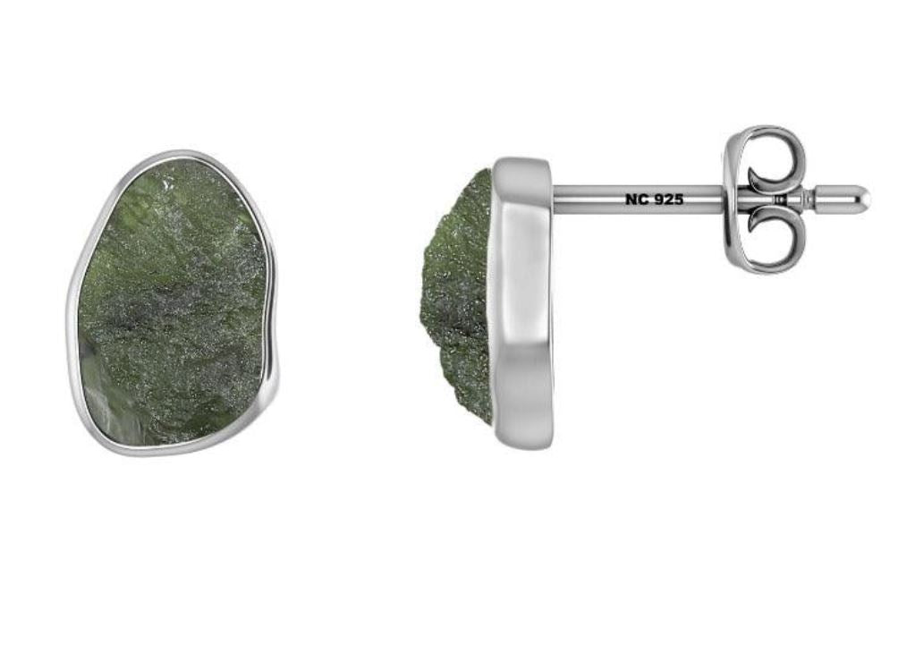 Natural Moldavite Bezel Stud Sterling Silver Earrings