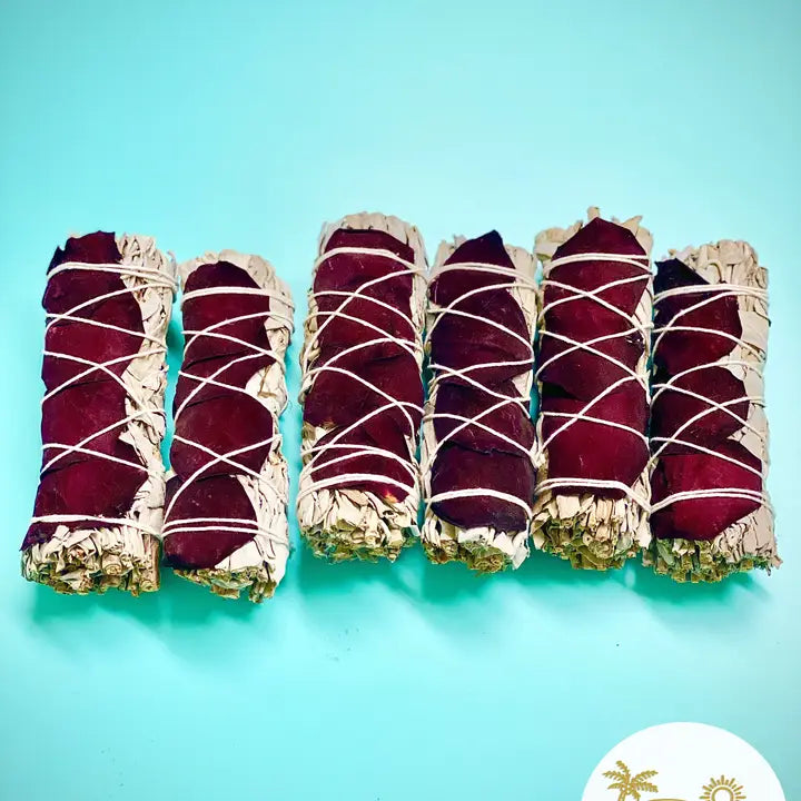Premium quality hand-harvested and hand-tied California white sage bundles/smudge sticks (4 inch) with organic Rose Petals.