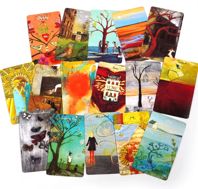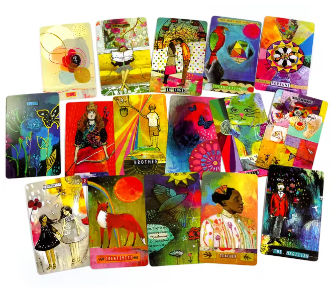What is synchronicity? From creator Cathy Nichols: "The term synchronicity was popularized by psychologist Carl Jung to explain meaningful coincidences. With this 78-card deck, I wanted to enhance the magic of the cards by courting synchronicity in the creative process itself. So, I invited the universe to co-create this deck with me by using dice, game spinners, random color palettes and intuition to guide each painting in the series."