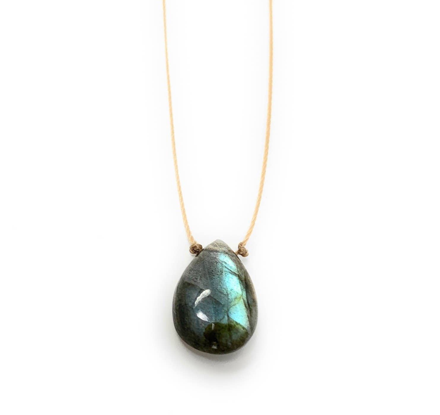 A flashy labradorite teardrop, hand knotted light brown cord (heat set delicate nylon thread with strong durability and resistance to fraying), sterling silver clasp