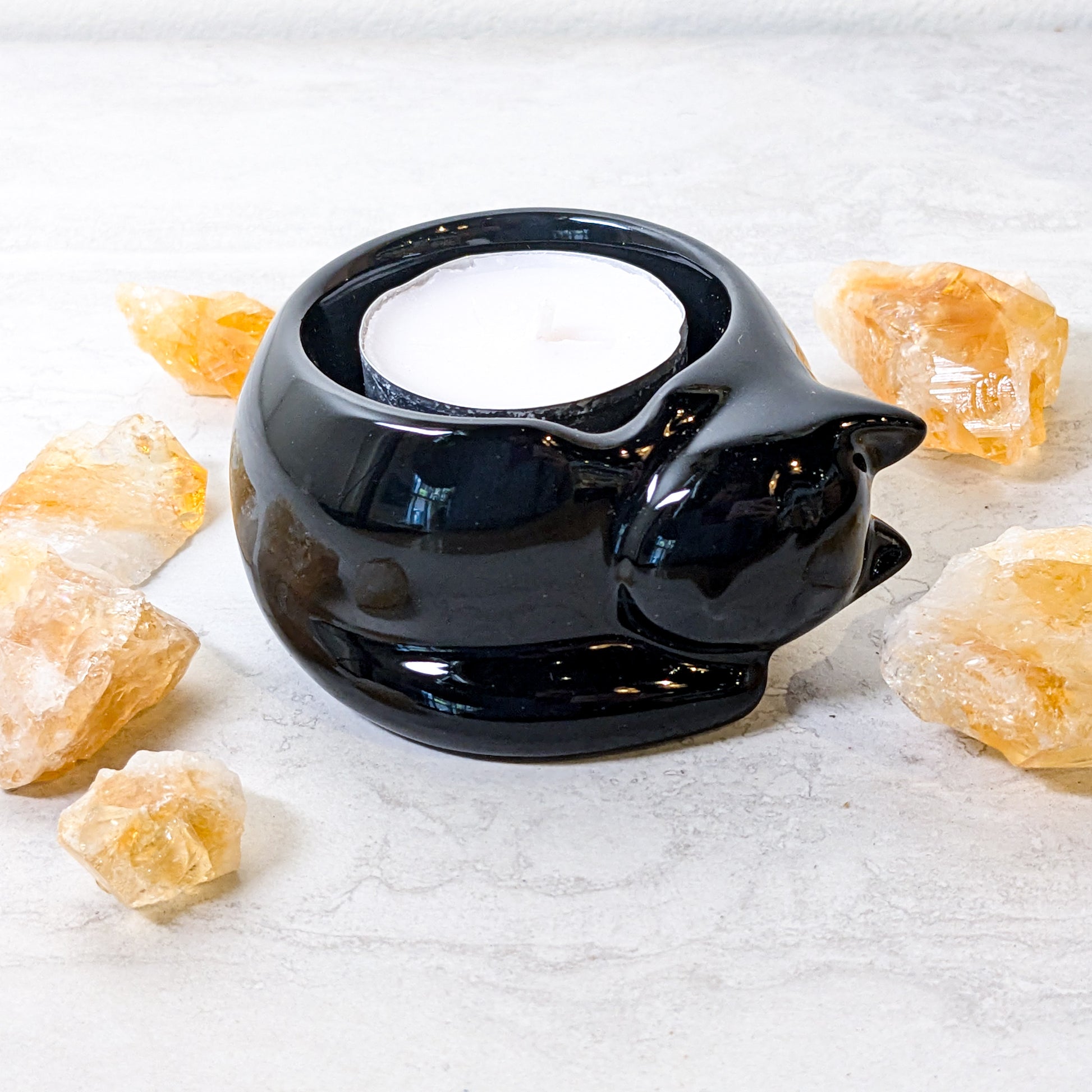 Purrfect for adding intrigue and spooky vibes to your home! This ceramic tealight holder features a sweet sleeping cat and accommodates a standard single tealight. Ideal for enhancing both modern and eclectic interior spaces.